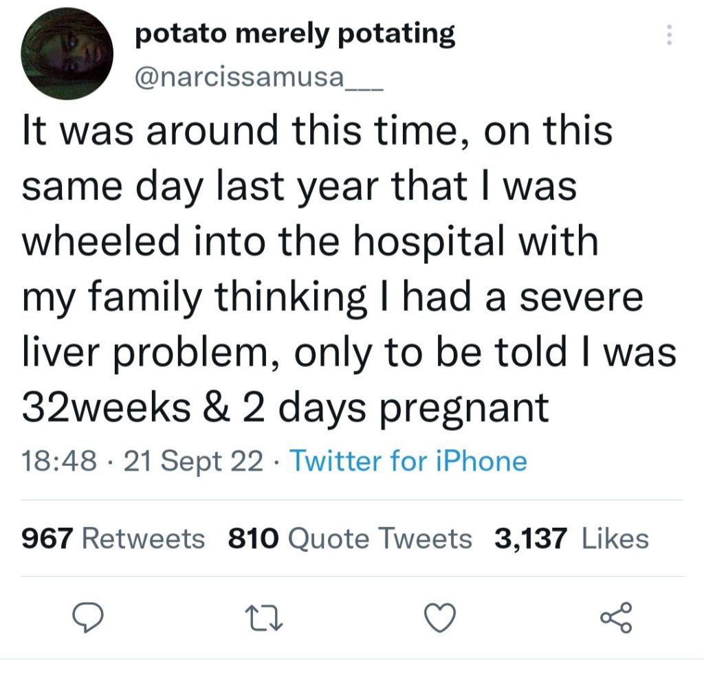 She added that when she was 5 months pregnant, she stumbled on a thread where woman were sharing how they didn’t know they were pregnant until it had progressed, and she thought it could never be her, not knowing she was pregnant already.
