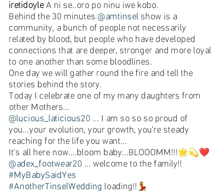 “A ni se…oro po ninu iwe kobo. Behind the 30 minutes @amtinsel show is a community, a bunch of people not necessarily related by blood, but people who have developed connections that are deeper, stronger and more loyal to one another than some bloodlines. One day we will gather round the fire and tell the stories behind the story.