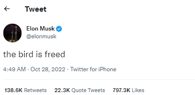 Musk then took to Twitter, also known as “the bird app” to write: “The bird is freed.”