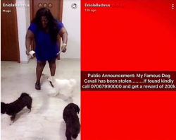 Nollywood actress, Eniola Badmus has raised alarm over her stolen dog, thereby, offering N200,000 cash reward to anyone, who finds it.
