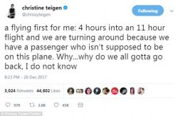 Teigen, who was traveling with husband John Legend, wrote on Twitter that the plane was turned around about four hours into the flight. The Twitter world watched in amusement as Teigen kept her followers updated on the ordeal, which apparently involved an hours-long wait at the airport, unanswered questions, some police presence and a microwaveable Ramen meal.