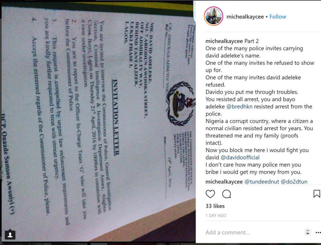 “michealkaycee@davidoofficial I think and know that you know and understand what it means to bring this whole drama on to social media.