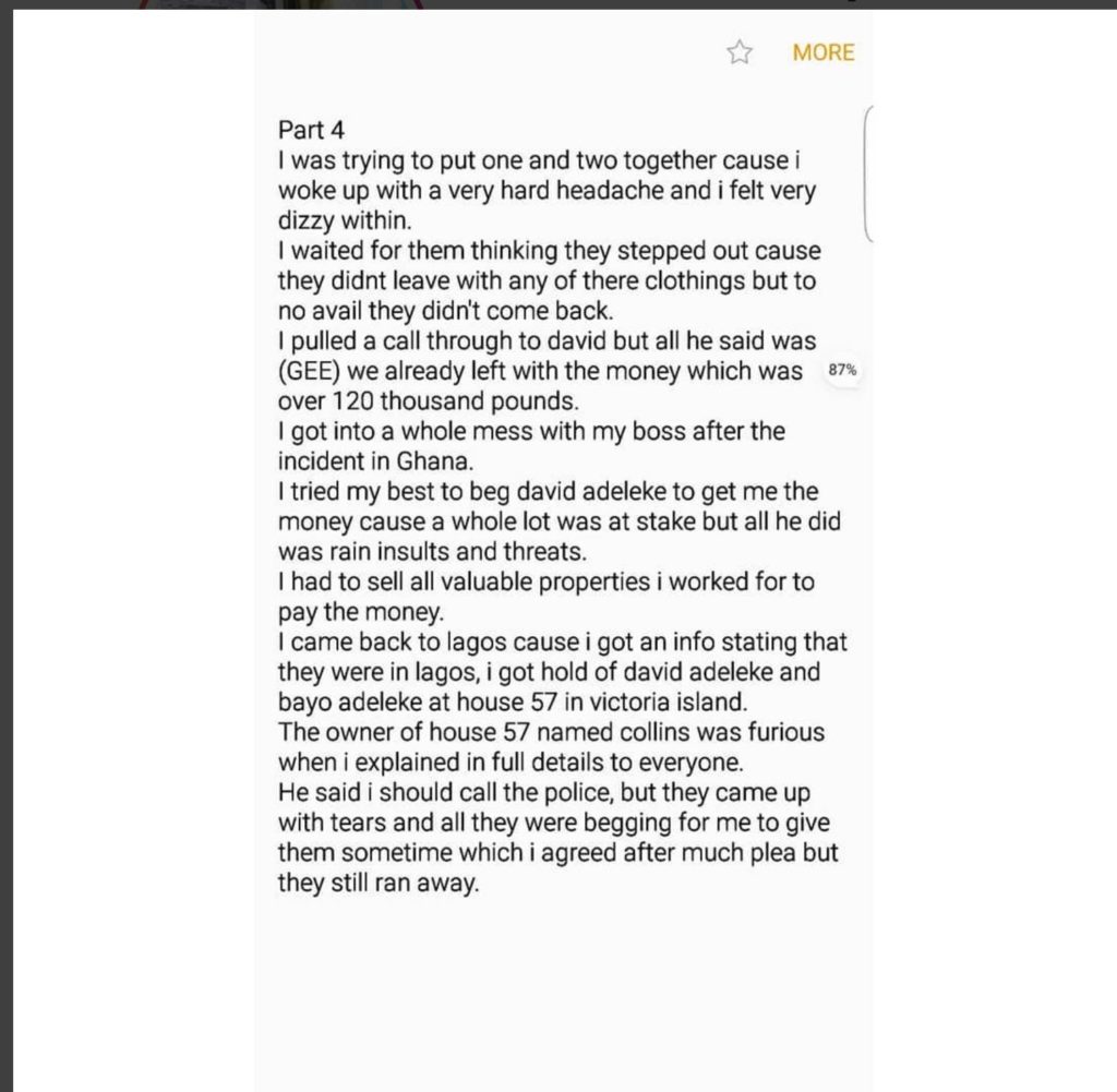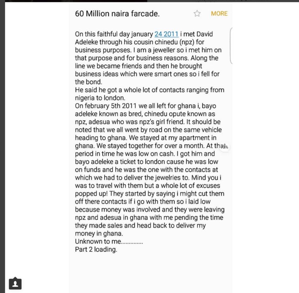 “On this fateful day January 24, 2011, I met David Adeleke through his cousin Chinedu (npz) for business purposes. I am a jeweller so I met him on that on purpose and for business reasons. Along the line we became friends and then he brought business ideas which were smart ones so I fell for the bond.