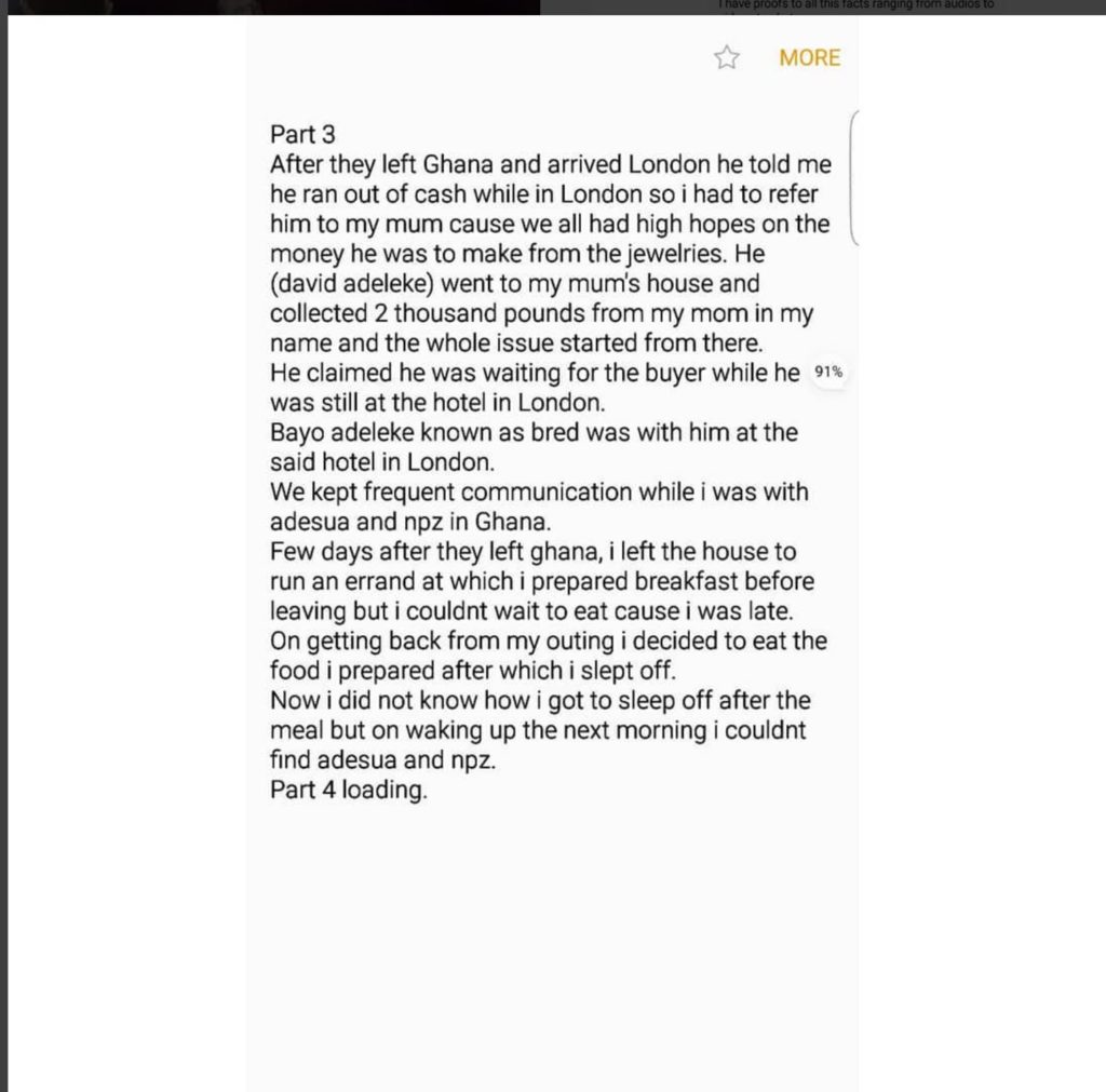 “On the 5th February 2011, we are left for Ghana, I, Bayo Adeleke known as bred, Chinedu Opute known as npz, Adesua who was npz’s girlfriend…”