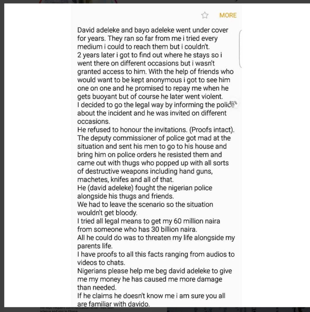Kazeem who claimed to be a friend of the “Fall” crooner alleged that Davido absconded with his N60 million naira.