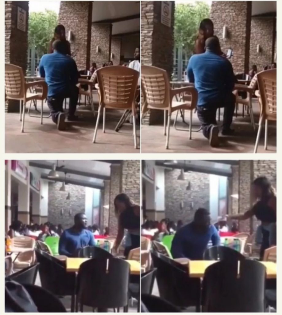 In a viral video, the lady was first seen arguing with her boyfriend who was on one knee proposing before she poured water from a drinking glass on him and walked out of the mall.
