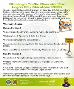 The Lagos State Government has announced a traffic diversion plan ahead of the 2026 Lagos City Marathon scheduled for Saturday, February 14.