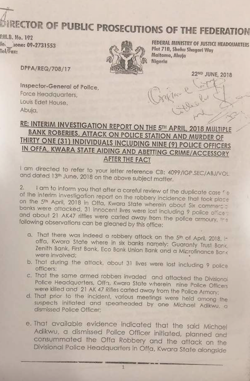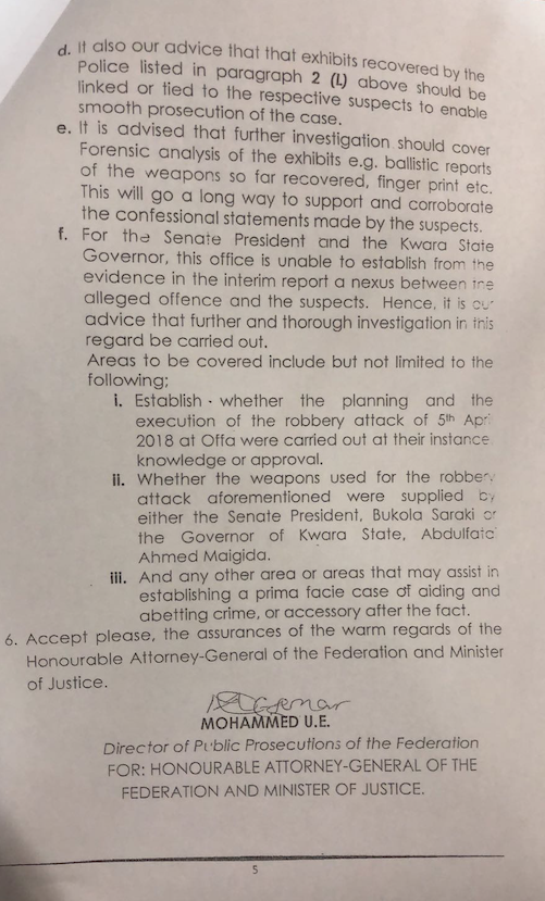 In a letter seen by TheCable, Mohammed U.E, director, public prosecution of the federation, wrote Idris Ibrahim, inspector-general of police, saying from evidence in the interim report on the matter, his office could not establish a nexus between Saraki, Ahmed, and the suspects.