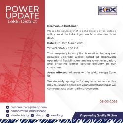 The Eko Electricity Distribution Company (EKEDC) announced that the Lekki three days power outage will take place between March 13 and March 15, 2026, as engineers carry out network upgrade works at the Lekki Injection Substation.