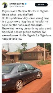 “Ten years as a medical doctor in Nigeria. This is what I could afford. On this particular day, some young boys in a Lexus were laughing at me with my tie under the hot sun of Abeokuta,” he wrote on Tuesday, February 17, 2026.