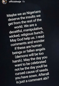 Nigerian singer and songwriter, Waje slammed Nigerians who drop negative and hurtful comments on social media.