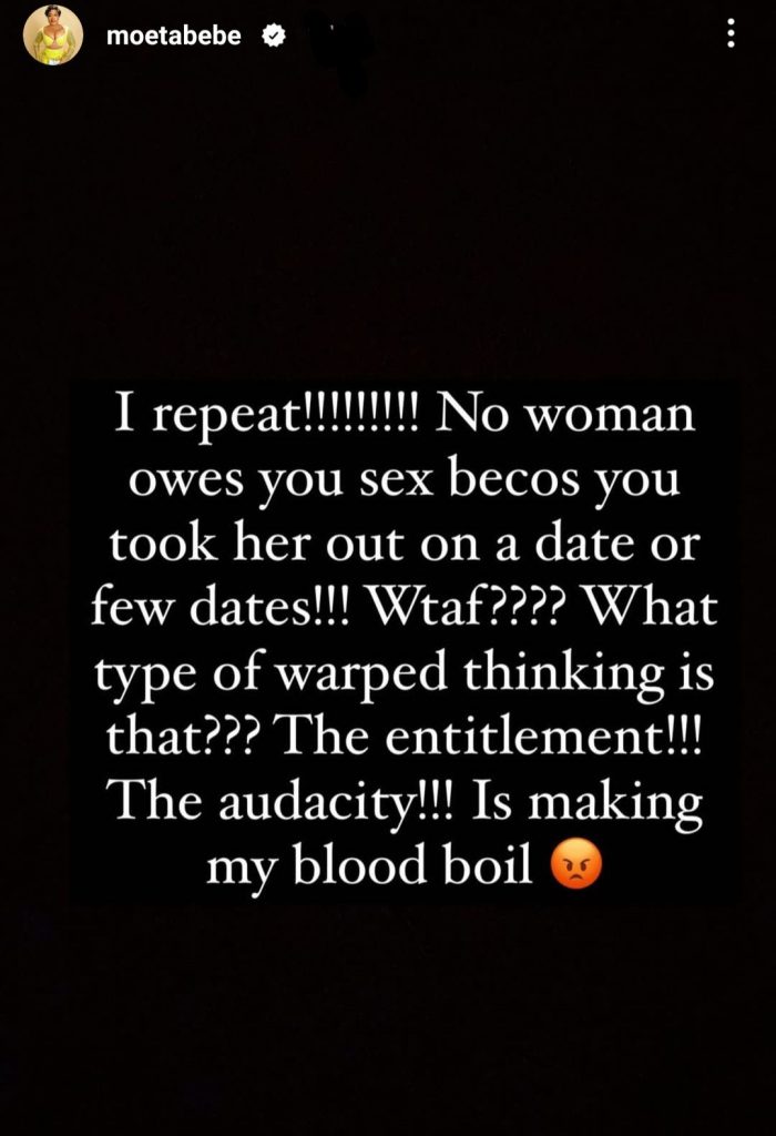 Describing it as a warped mentality, Moet said the ”entitlement” makes her blood boil. Read the post shared on her Instastories below…