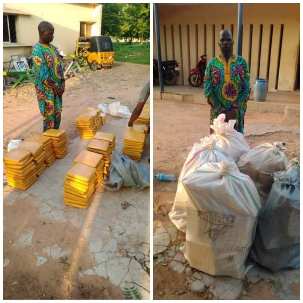 Abdulrazak Ajibade, a notorious Indian hemp trader, has been detained by the Katsina State Police Command, and 185 wrapped packets of dried leaves thought to be Indian hemp have also been found.