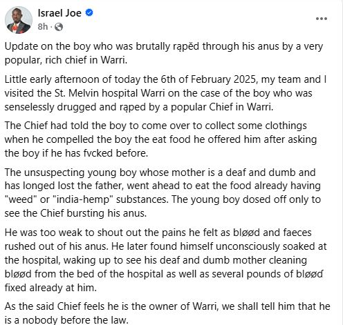 A teenage boy in Warri, Delta State, is fighting for his life after allegedly being drugged and sexually assaulted by a well-known local chief. Human rights activist Comrade Israel Joe exposed the case in a Facebook post on Thursday, February 6, 2025, after visiting the victim at St. Melvin Hospital.